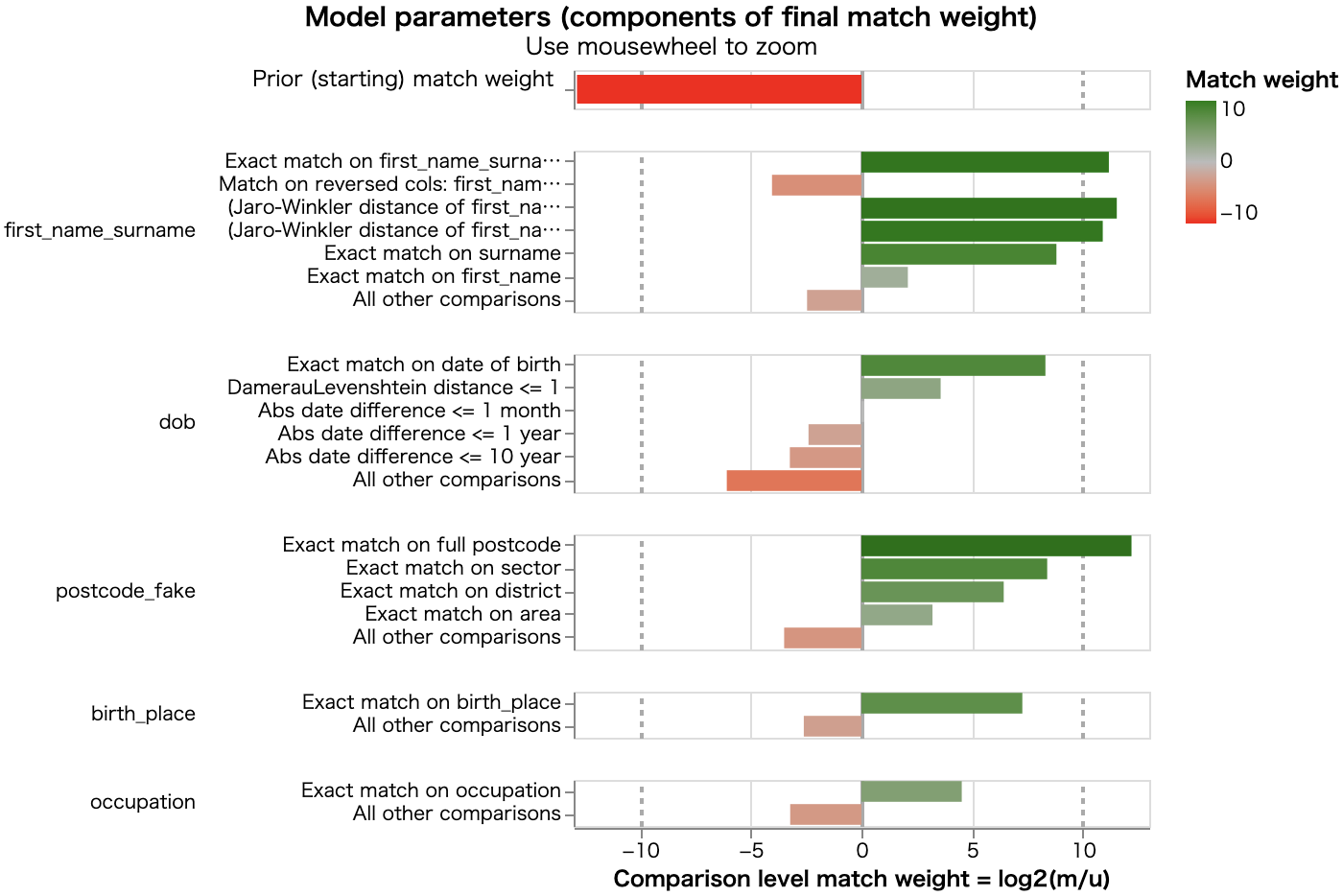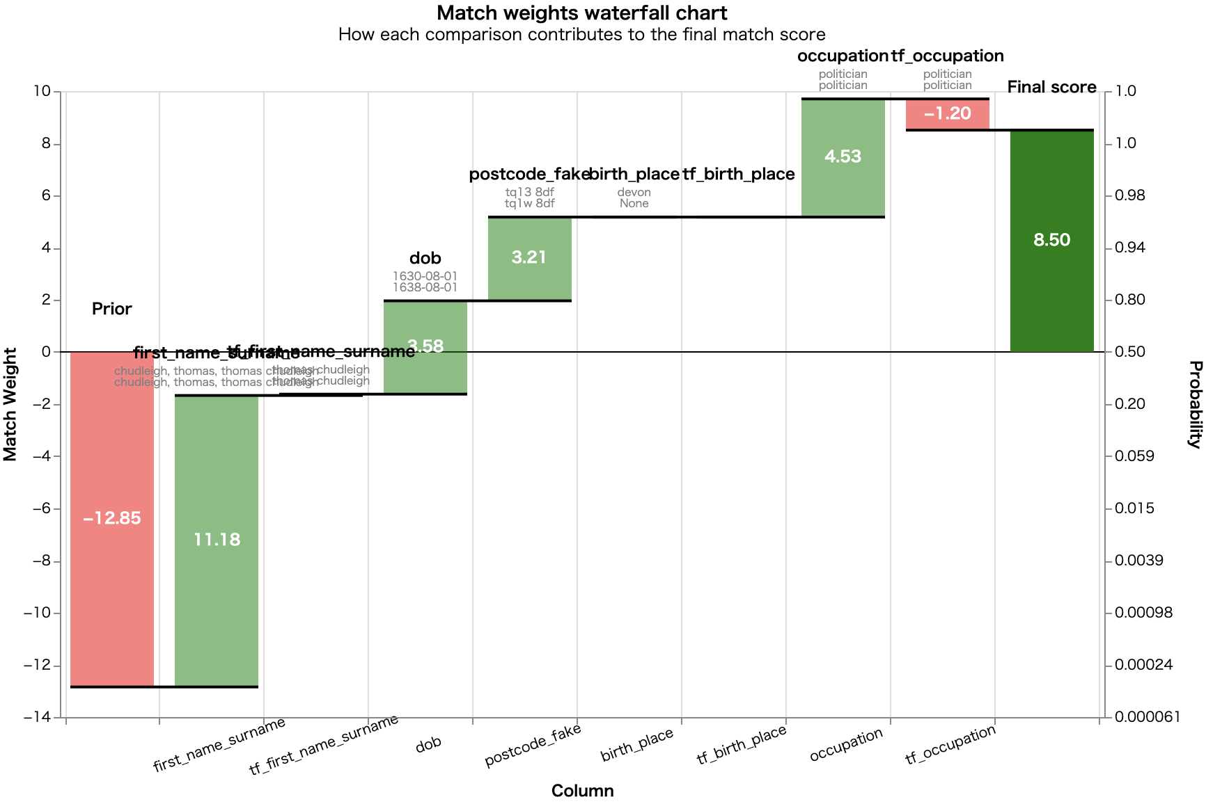 一番右の濃い緑のバーは2つのレコードの合計マッチウェイト。