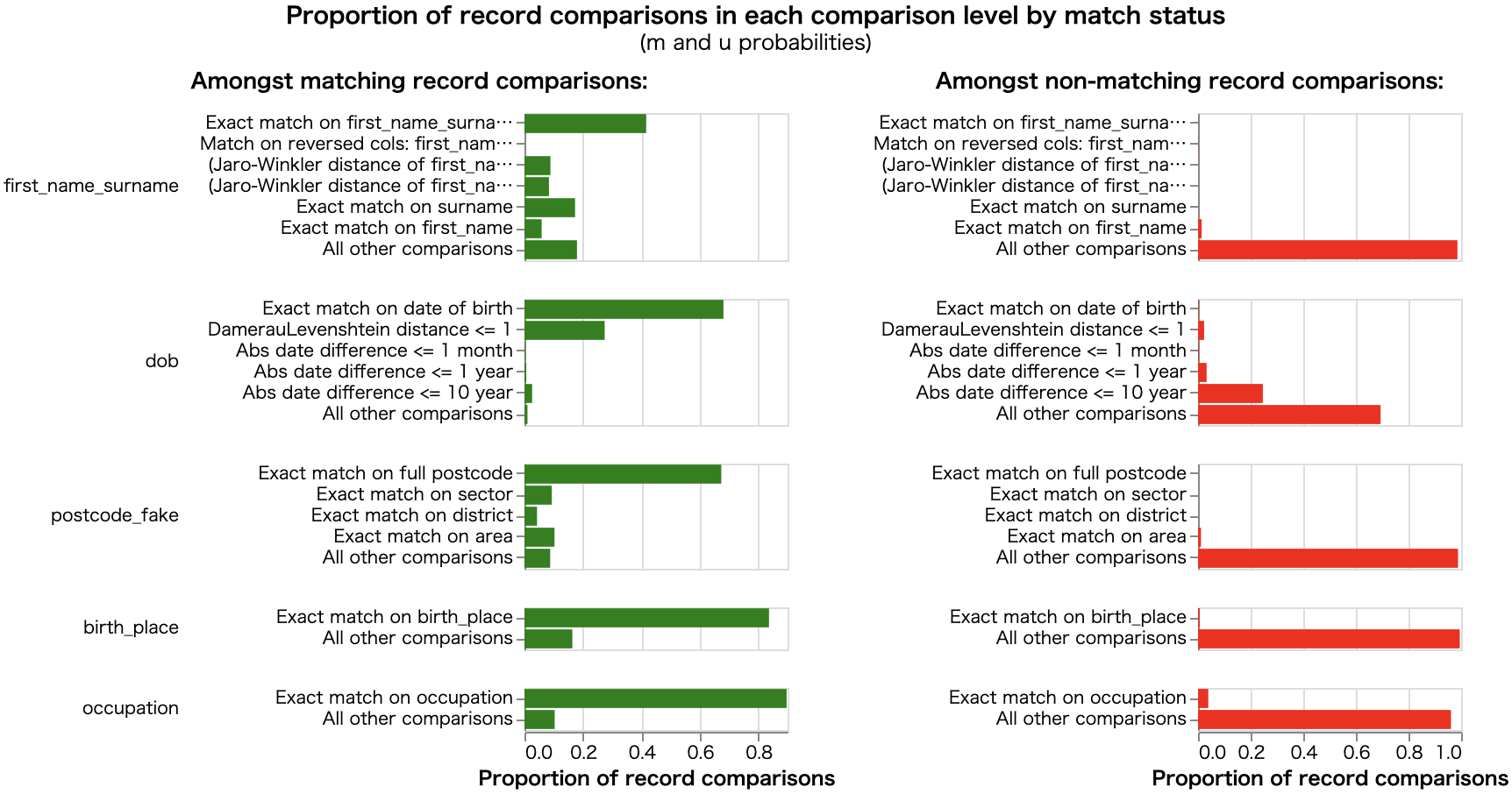 > Iteration 4: Largest change in params was 0.00532 in the m_probability of first_name_surname, level `All other comparisons`