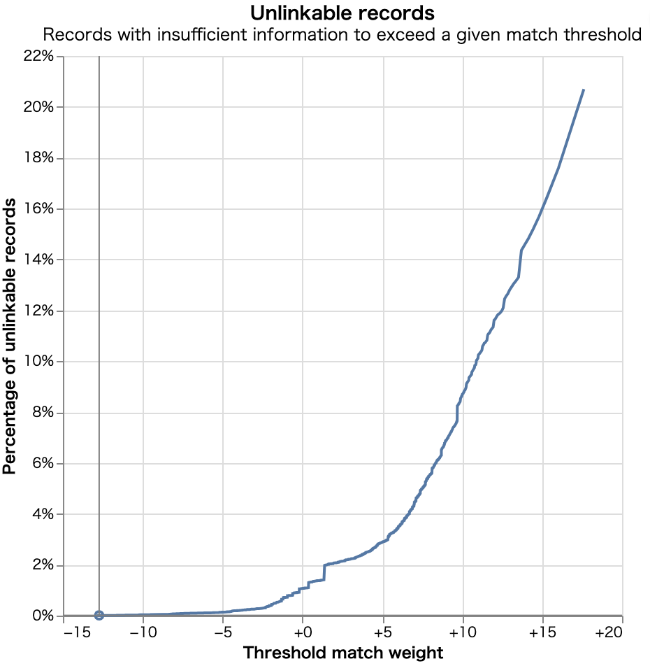 横軸は「マッチウェイトの閾値」。縦軸は「リンクするのに十分な情報が含まれないレコード」の割合。